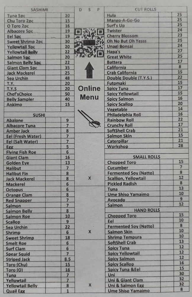 Tuna, salmon, albacore, eel, shrimp, spicy tuna and pcs california roll