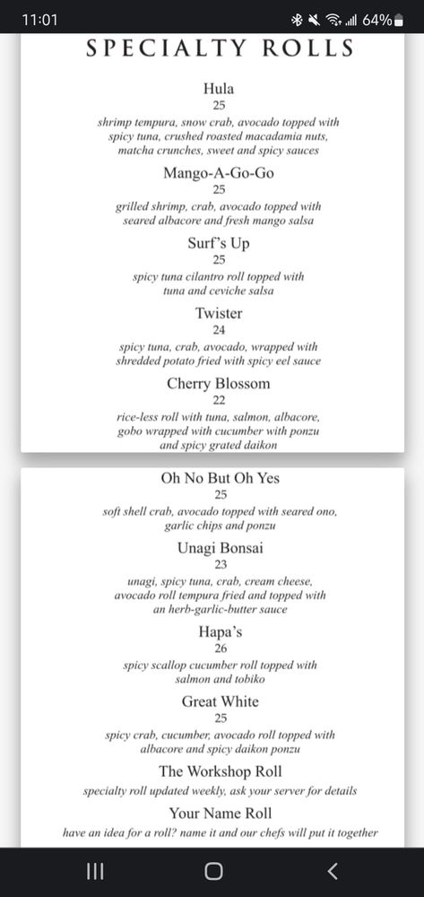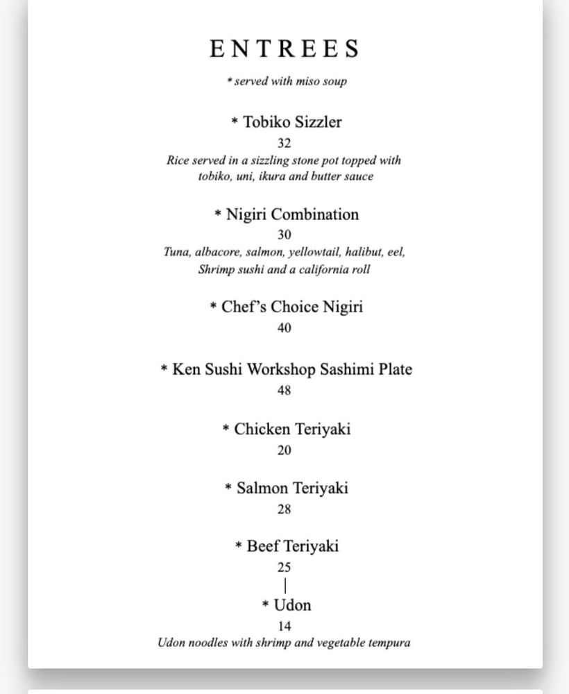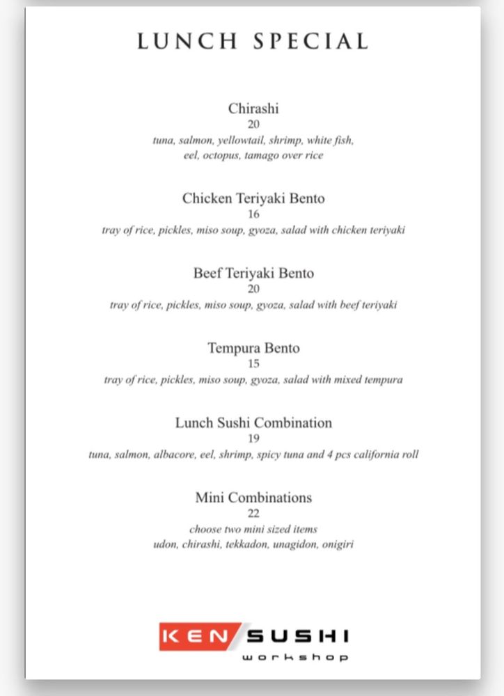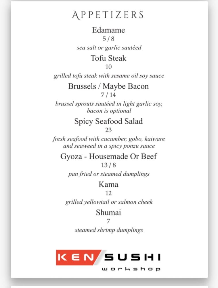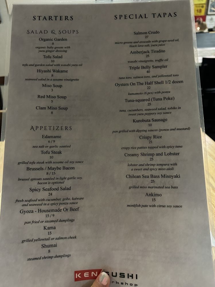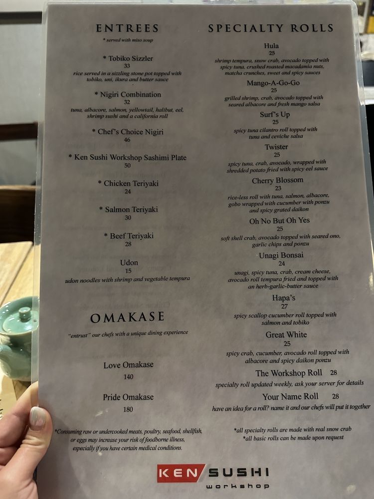 The menu at Ken Sushi Workshop is extensive, featuring creative rolls and standard fish options. Customers praise the fresh selection of fish and the consistently good and fresh dishes. Specialties like the Love Omakase and unique offerings like torching nori for hand rolls showcase Chef Ken's artistry and dedication to his craft.